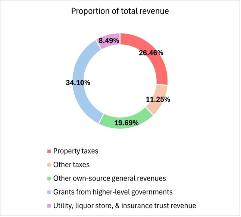 The US Census collects data on state and local finances. In the US, state and local governments raised about $650 billion in property tax revenue in fiscal years ending in 2022, amounting to 27 percent of all state and local tax revenue. Ninety-seven percent of property tax revenue is local rather than state. Local governments rely on property taxes for over a quarter of their total revenue and about 40 percent of “own-source” revenue—revenues raised by local governments rather than given to them by higher-level governments (Fig. 1).